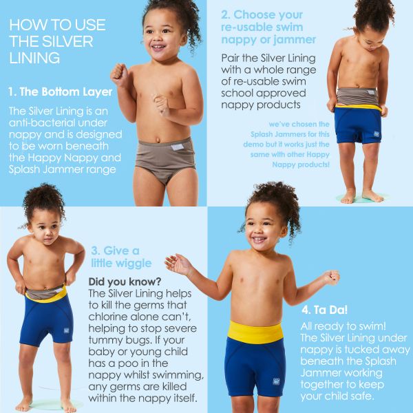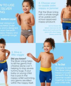 Pralna kopalna podloga za Happy Nappy Splash About – Silver lining podloga, ki s srebrovimi ioni dokazano uniči patogene kot so Cryptosporidium and E-Coli, še preden preidejo v vodo. Narejena, da se nosi pod Happy Nappy in Splash Jammer Splash About artikli, kot del dvojnega sistema.
